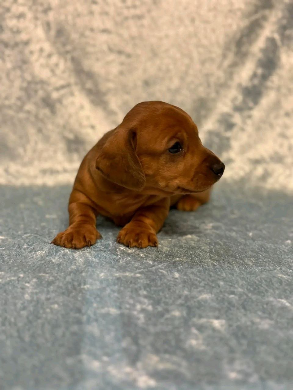 Description: Meet Ruby, the sweetest little smooth-coated red miniature dachshund! She has a gorgeous, deep red coat that shines beautifully in the light, with a tiny touch of black shading on her ears and tail. Her short, sleek fur is super soft and she has the classic long body and adorable floppy ears that make dachshunds are famous for. Ruby’s big, dark, shiny eyes and gentle, curious expression will melt your heart the moment you see her.