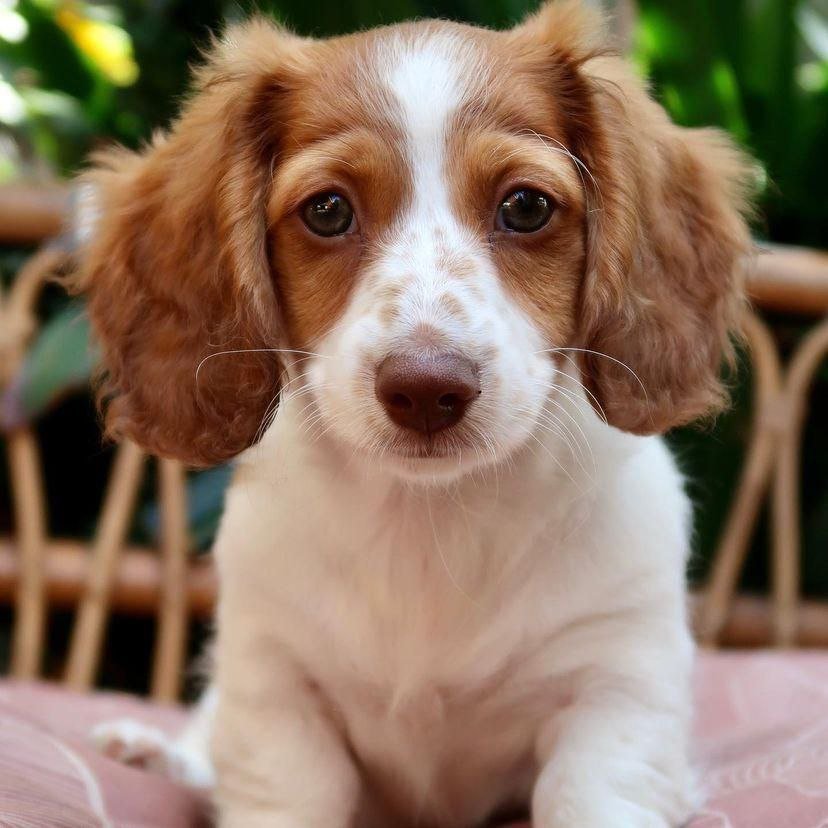 Description: This precious girl is Daisy, an adorable long-haired miniature dachshund with the classic red piebald pattern. She has a rich, warm red coat that blends into bright white on her chest, legs, and blaze up her face, finished with just a few sweet freckles across her nose. Her silky, flowing hair is already feathering beautifully on her ears, tail, and little legs, giving her the fluffiest, most huggable look. Daisy’s big, shiny dark eyes and gentle expression make everyone smile the moment they see her.